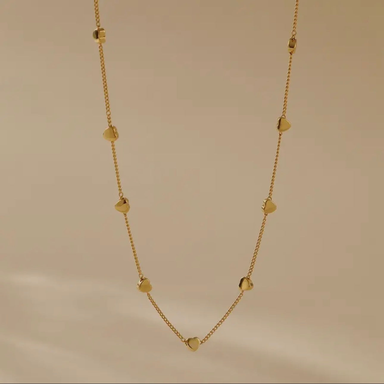 18K gold plated Stainless Steel Non-Tarnish Station of Puffy Heart Necklace, crafted from premium stainless steel with a luxurious 18K gold finish, this necklace features a series of charming puffy heart pendants stationed along the chain.