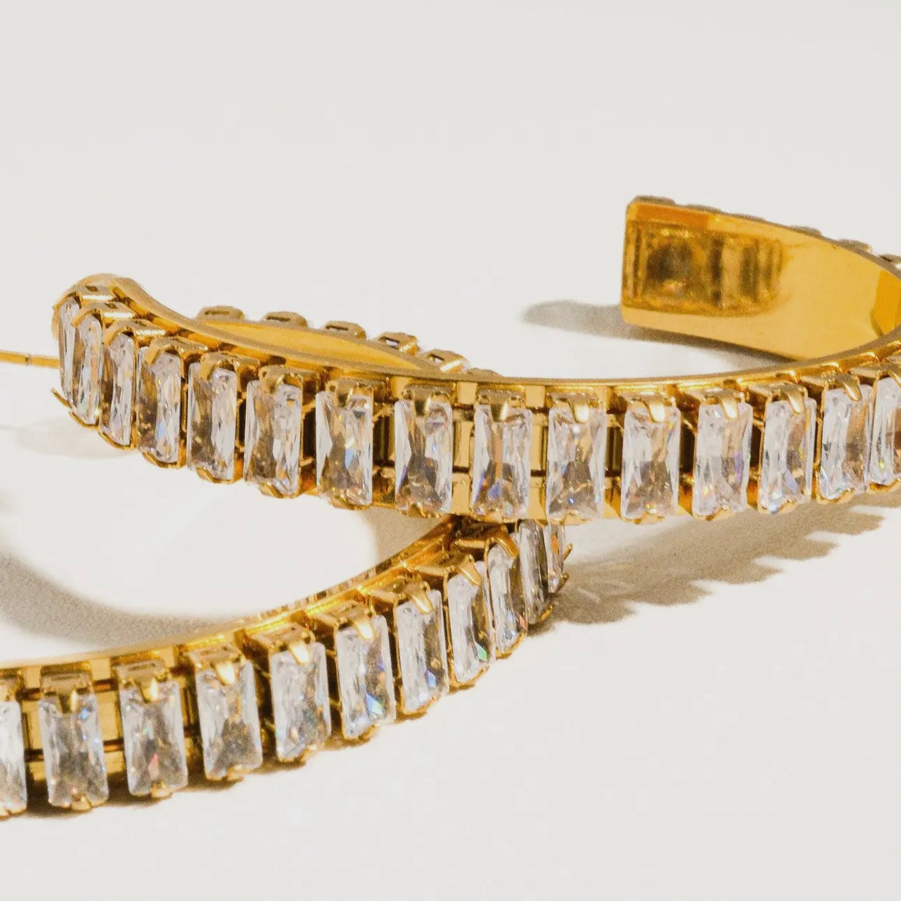 Add a touch of luxe to any outfit with our LUXE McKenzie 18K Gold Plated Non-Tarnish Hoop Earrings. With a rectangular pave inlay, these hoops are both glamorous and durable. Elevate your style with these statement-making, non-tarnish earrings. (No more worrying about polishing them!)