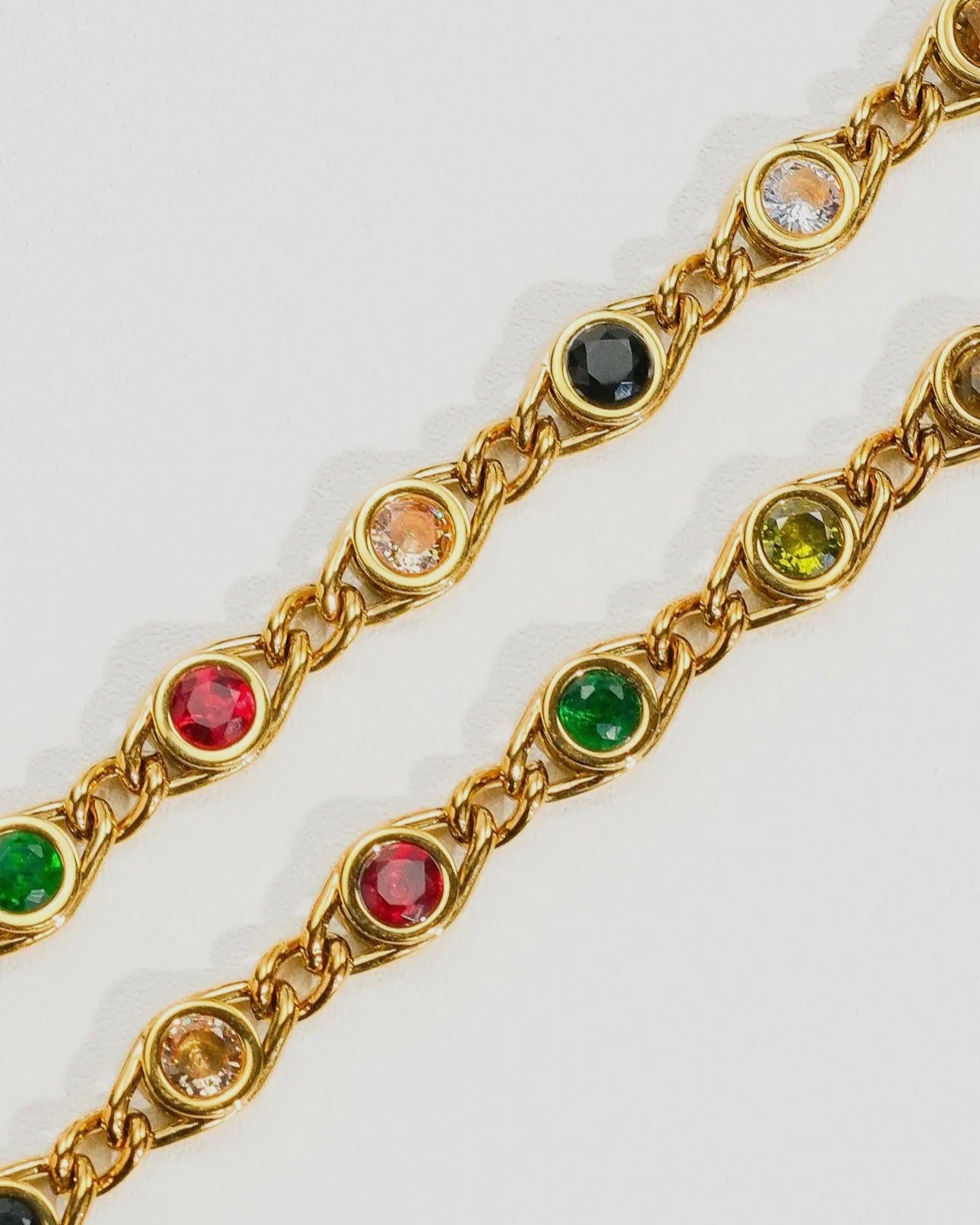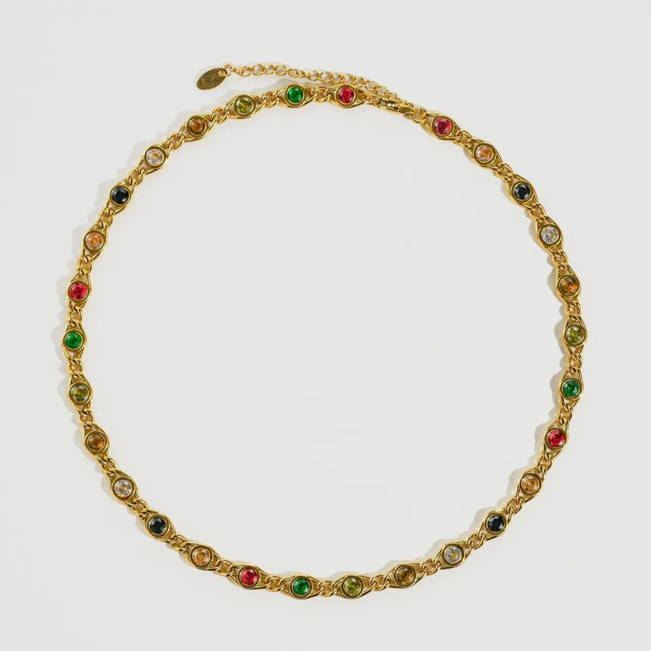 Enhance your style with our Gold-Plated Colored Cubic Zirconia Necklace, boasting a vintage allure and a touch of Spanish charm. This colorful choker adds a vibrant accent to your look, making it perfect for dressy occasions. It beautifully complements white suits and any neutral maxi dress, allowing you to embrace a sophisticated, yet playful aesthetic that captures the essence of timeless elegance with a hint of a Spanish-inspired vibe.