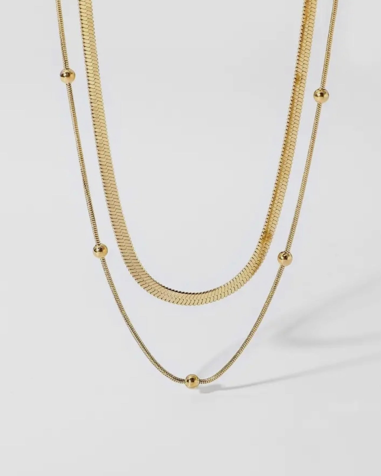Herringbone and Ball Snake Chain Necklace, this necklace features multiple layers intricately woven with herringbone, ball, and snake chains, creating a dynamic. Made from high-quality stainless steel with a luxurious 18K gold finish, it boasts waterproof and tarnish-free properties.