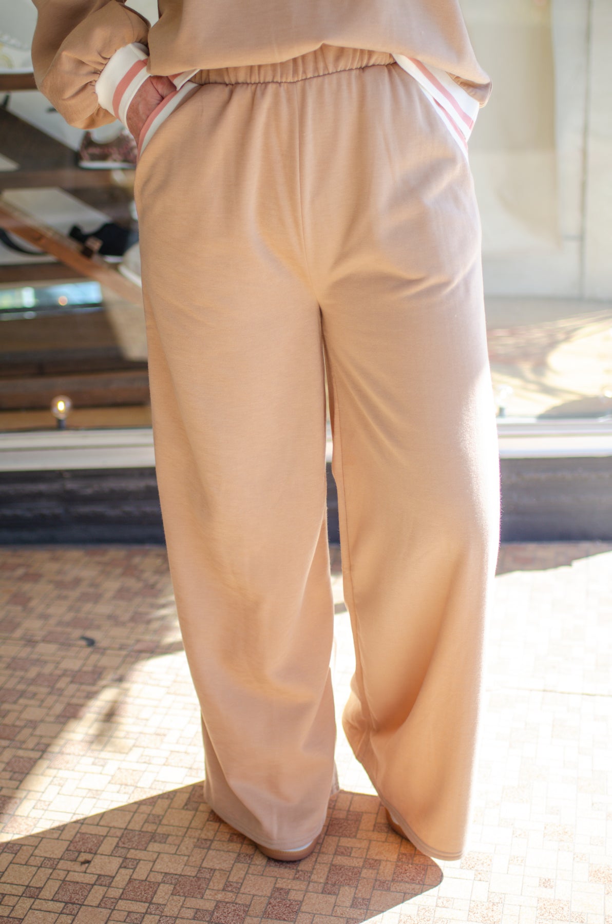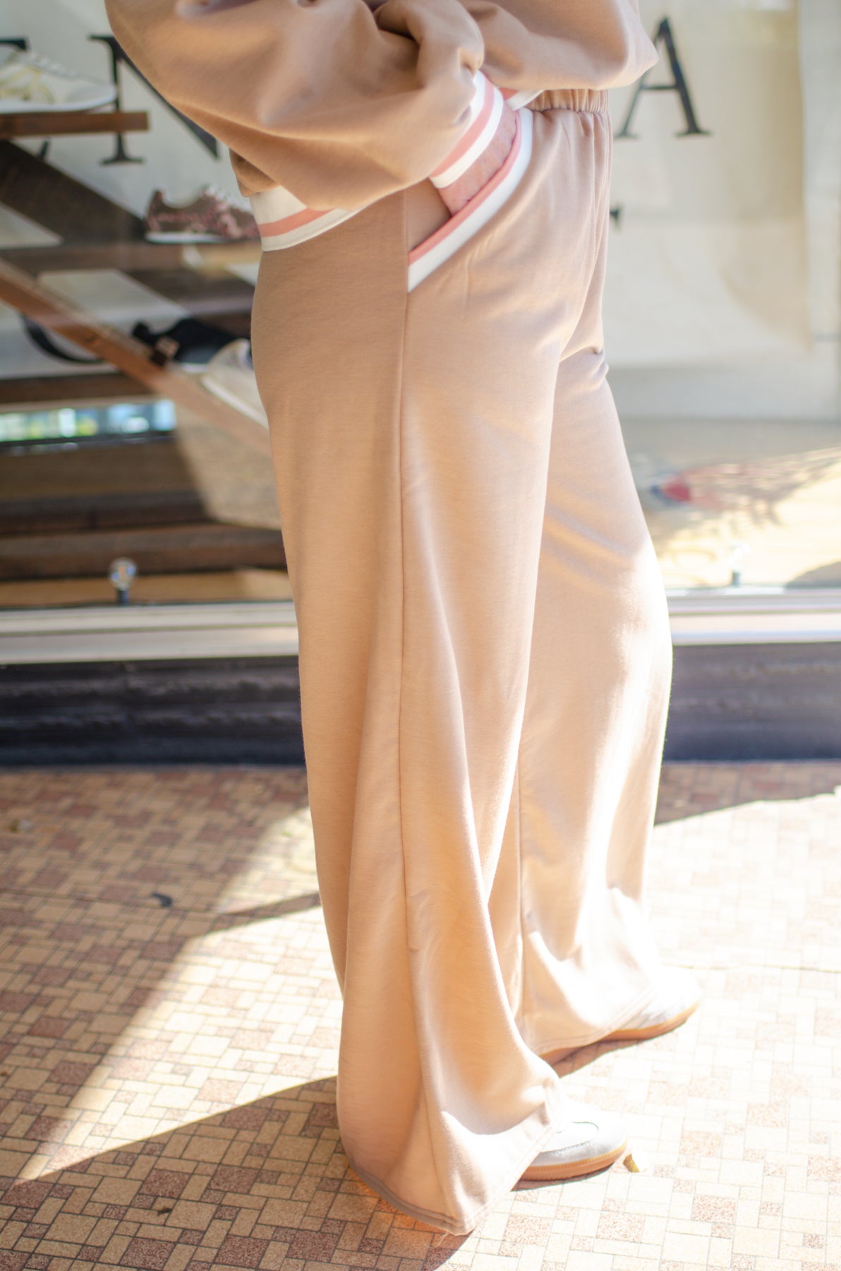 Make Your Day Tan Knit Wide Leg Pants with Pink & White Stripe Details