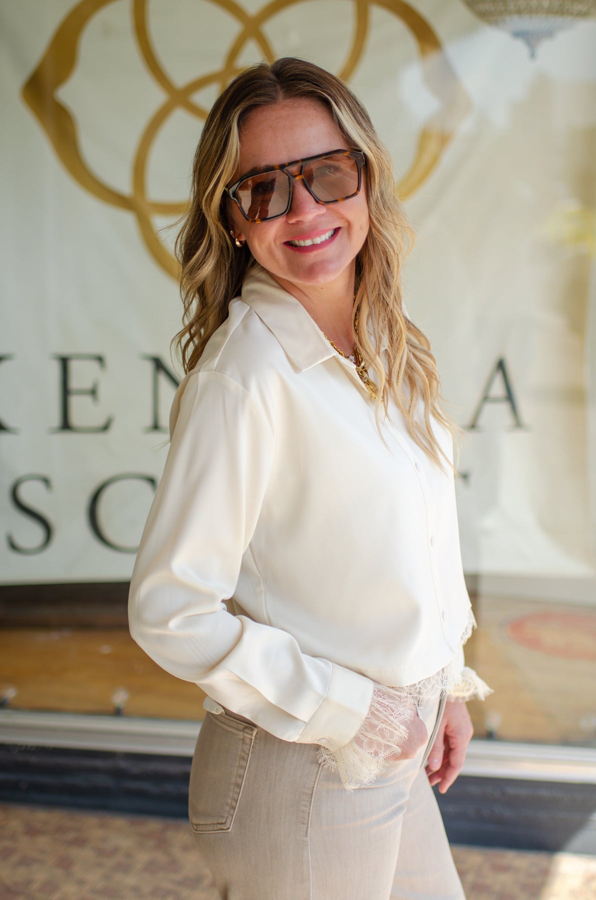 Get ready to fall in love with this top! It features a delicate lace hem and a silky champagne fabric that will make you feel glamorous. With its button-down and collared design, you'll be stylishly ready for any fall romance.