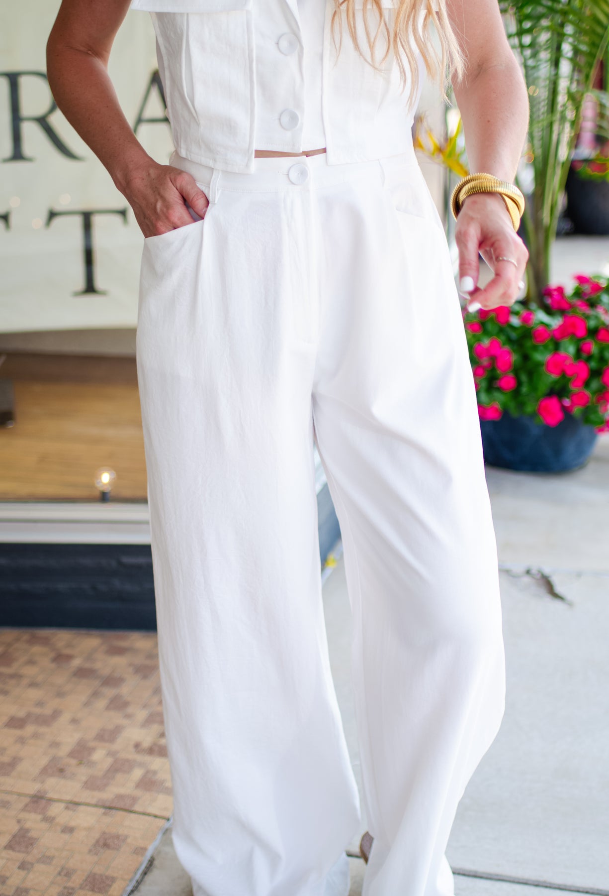 Step into sunshine-ready style with the Miami Moment High Rise White Pleated Front Pants. These crisp white pants feature a flattering high waist and playful pleated front, perfectly paired with handy pockets for your essentials. Whether you're strolling the city or dancing through the day, they bring a fresh, breezy vibe to any outfit.