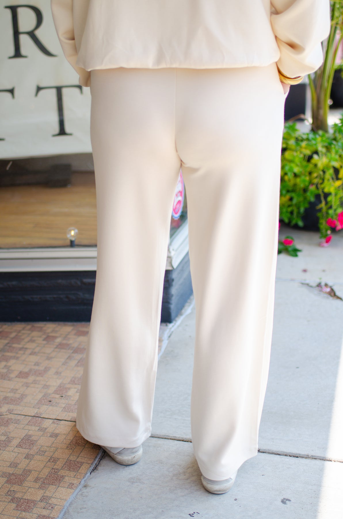Slip into cozy charm with the Heavenly Double Knit Stretch Waist Pant in Cream. These wide-leg beauties move with you, whether you're conquering errands or kicking back at home. The stretchy waistband promises comfort, while the soft knit fabric feels like a gentle hug all day long. Perfect for relaxation with a playful edge!