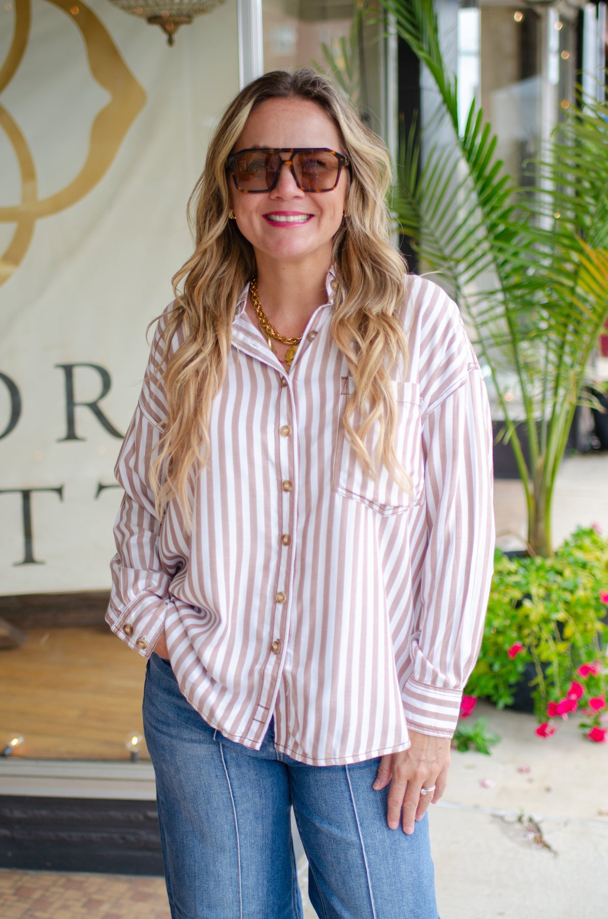 This brown striped button-down shirt blends timeless style with a laid-back vibe. Featuring a crisp collar, front pocket, and button cuff sleeves, it’s perfect for days when you want to keep it classic but casual. Whether you're headed out or staying in, this shirt adds an easygoing touch to your look with a dash of charm.