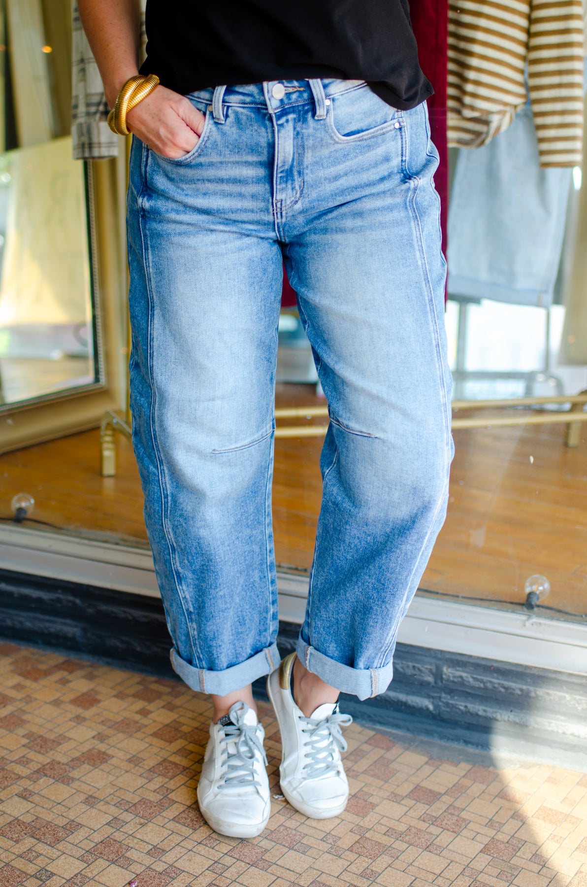 "Get your boyfriend jeans game on point with Risen High Rise Cuffed Barrel Jeans. The medium wash adds a vintage touch, while the high rise design elongates your legs. Perfect for a laid-back, stylish look.