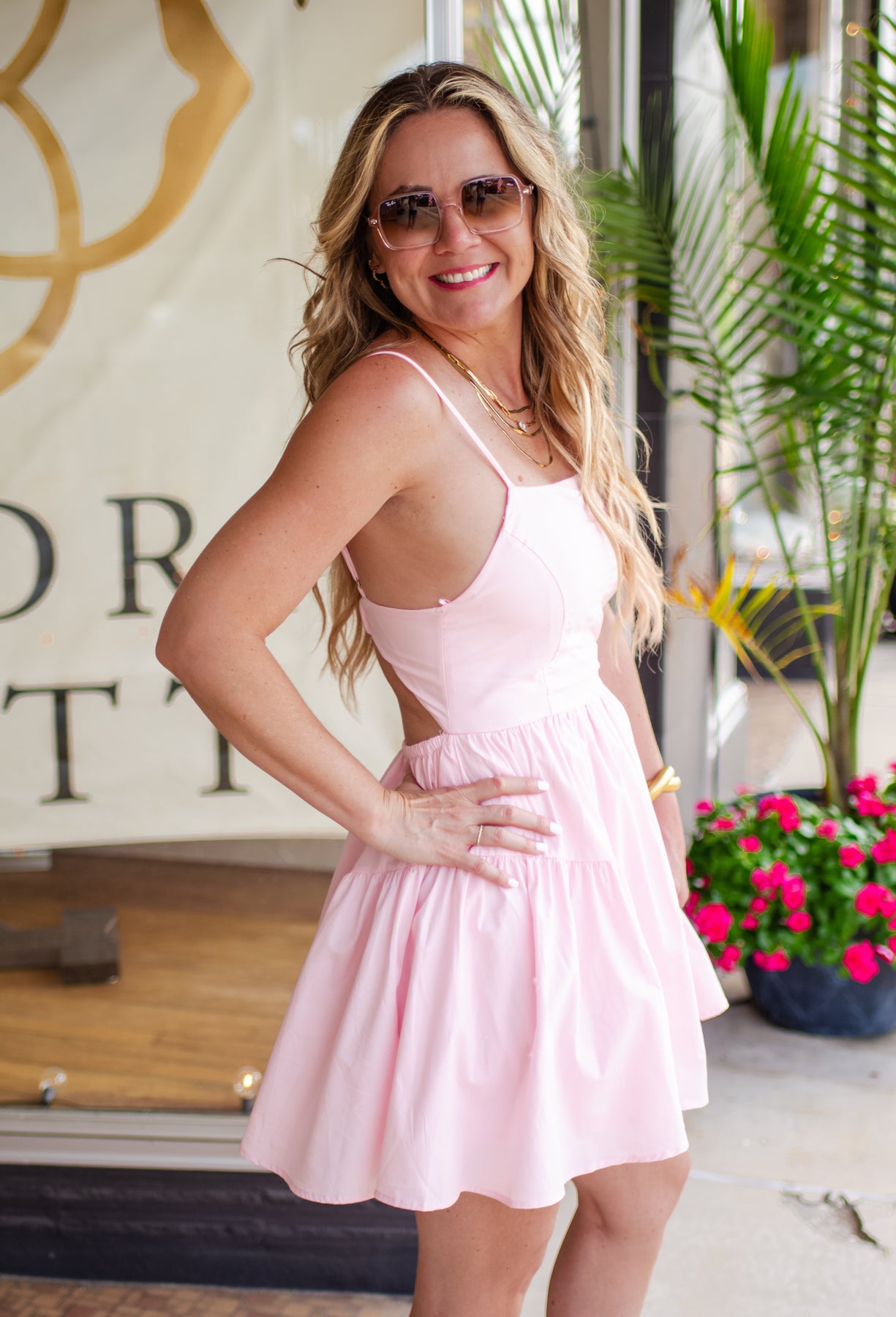 Step into a dreamy vibe with the Turn Back Time Corset Dress with a cutout back in Blush Pink. Featuring a flattering corset bodice and adjustable spaghetti straps for the perfect fit, this dress flows effortlessly with its soft, airy skirt. Whether you're twirling at a party or enjoying a sunny day out, its delicate blush hue and feminine silhouette make every moment feel magical.