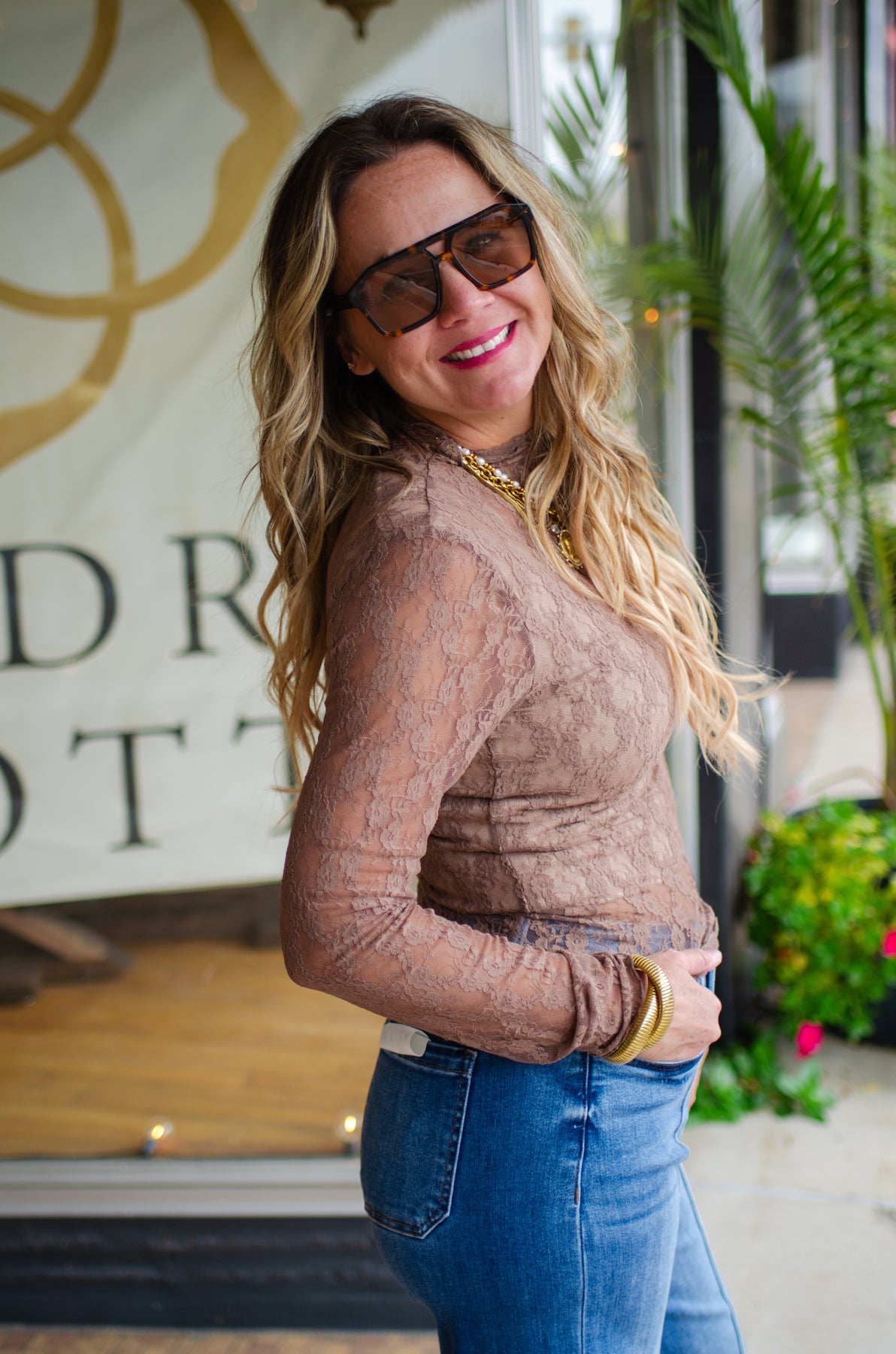 Embrace cozy charm with this Fall Romance fitted top, featuring a delicate floral print and a high neck trimmed in elegant lace. The mocha hue adds warmth, while long sleeves and sheer stretch fabric provide a flattering, comfortable fit perfect for crisp autumn days—and a touch of playful sophistication.