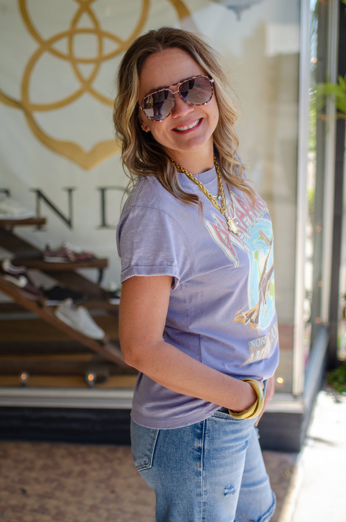 Lean into the vintage vibe. Pair this tee with a distressed, high-waisted denim skirt or some perfectly worn-in cutoffs and throw in some bandana.