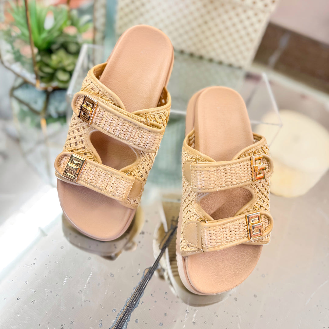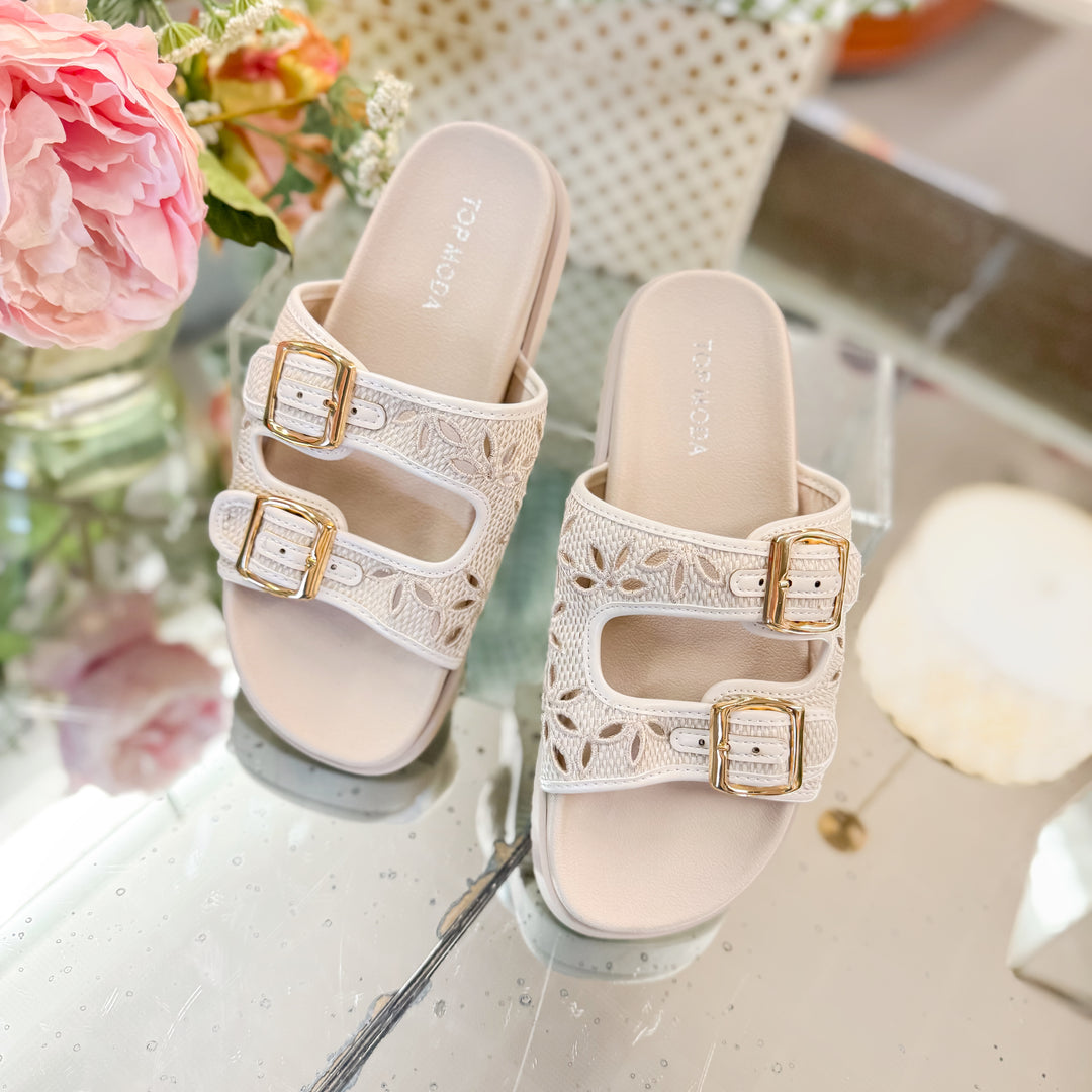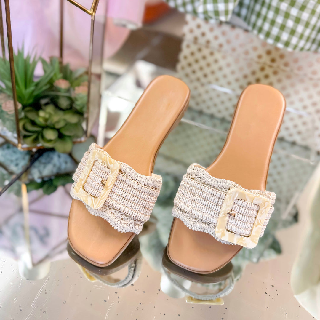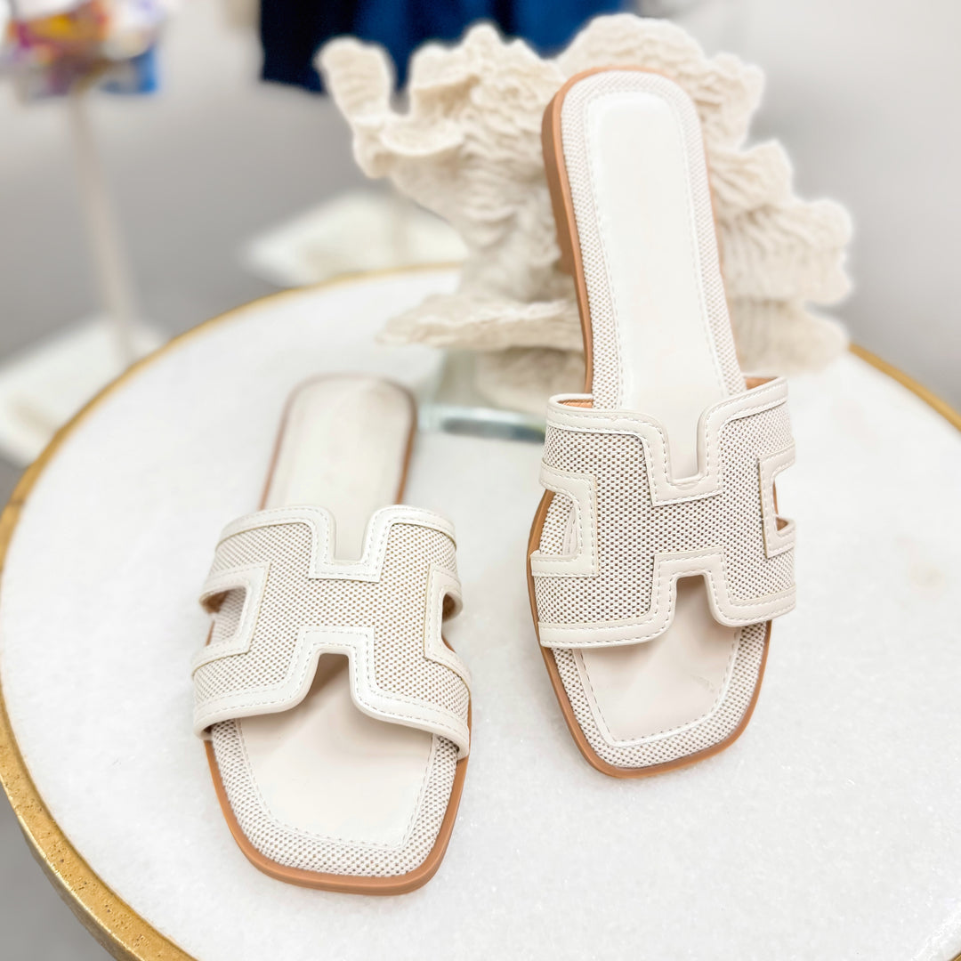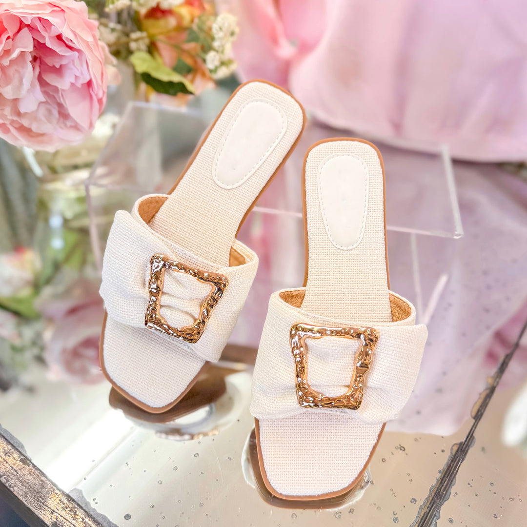 Elle Ivory Linen Gold Buckle Slide Sandal