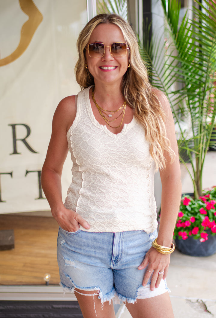Get ready to fall in love with our My Love Stretch Knit Ecru Tank! Made with stretchy textured fabric, this ecru cream tank features a playful notch front design. Perfect for a casual day out or a night on the town. (Love at first try-on not guaranteed. 😉)