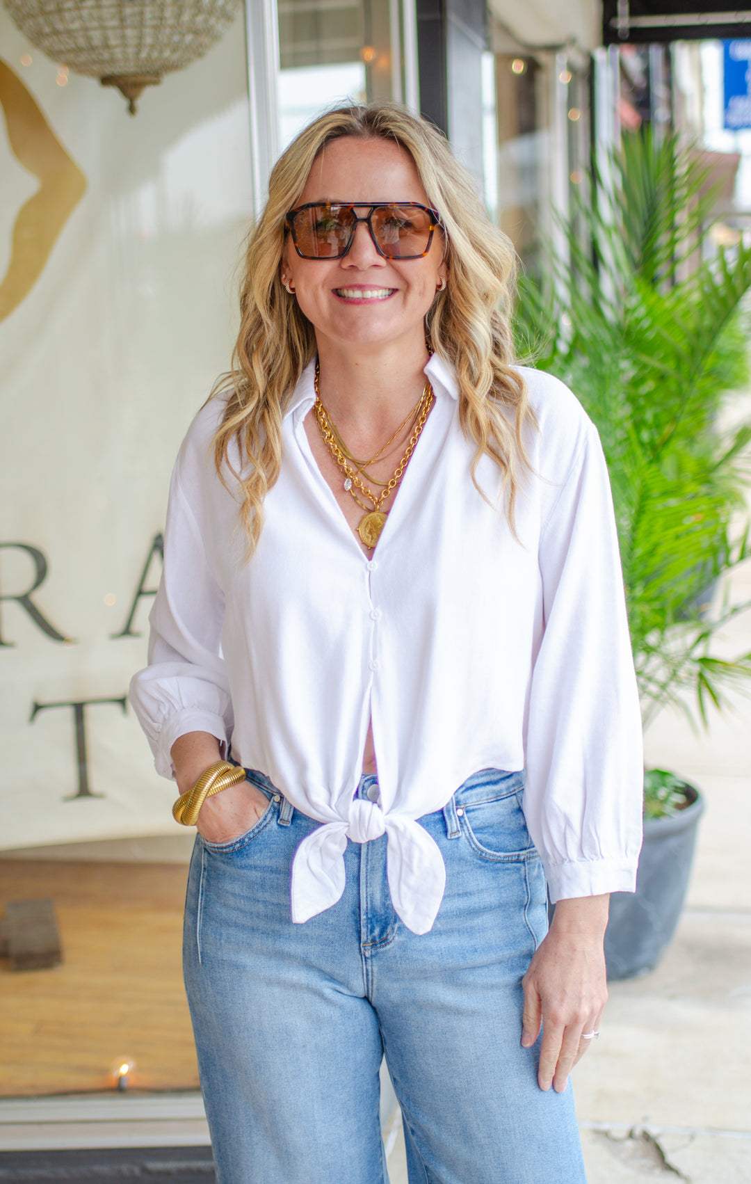 Simple Statement Button Down Tie Front White Linen Blouse
