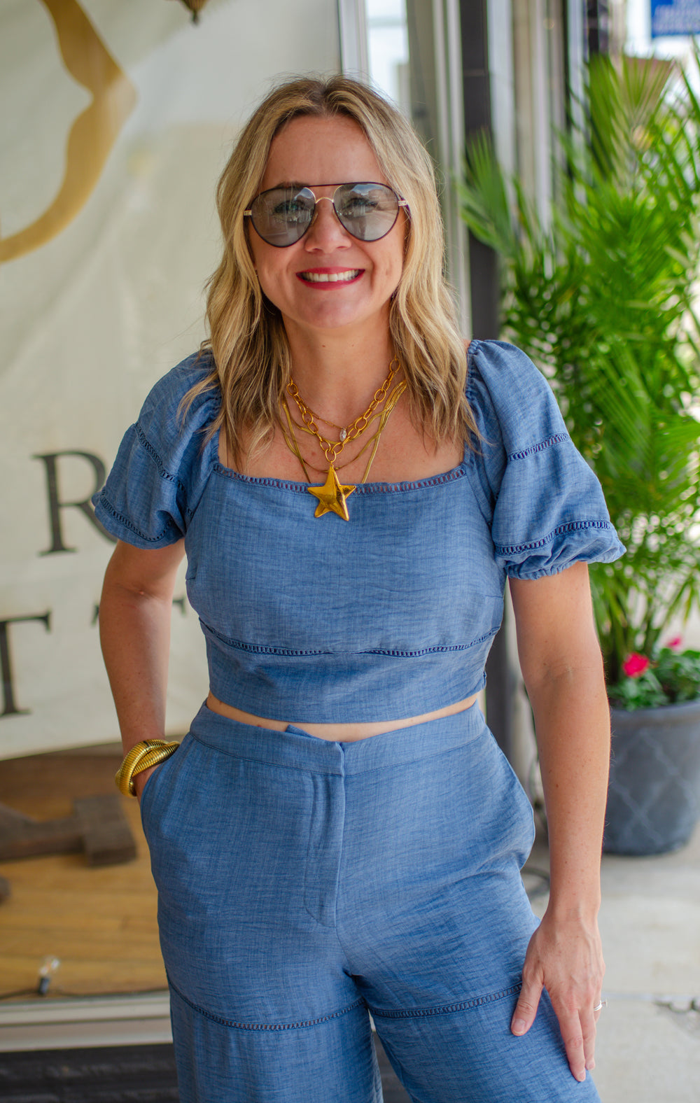 Day Date Cropped Bubble Sleeve Chambray Top
