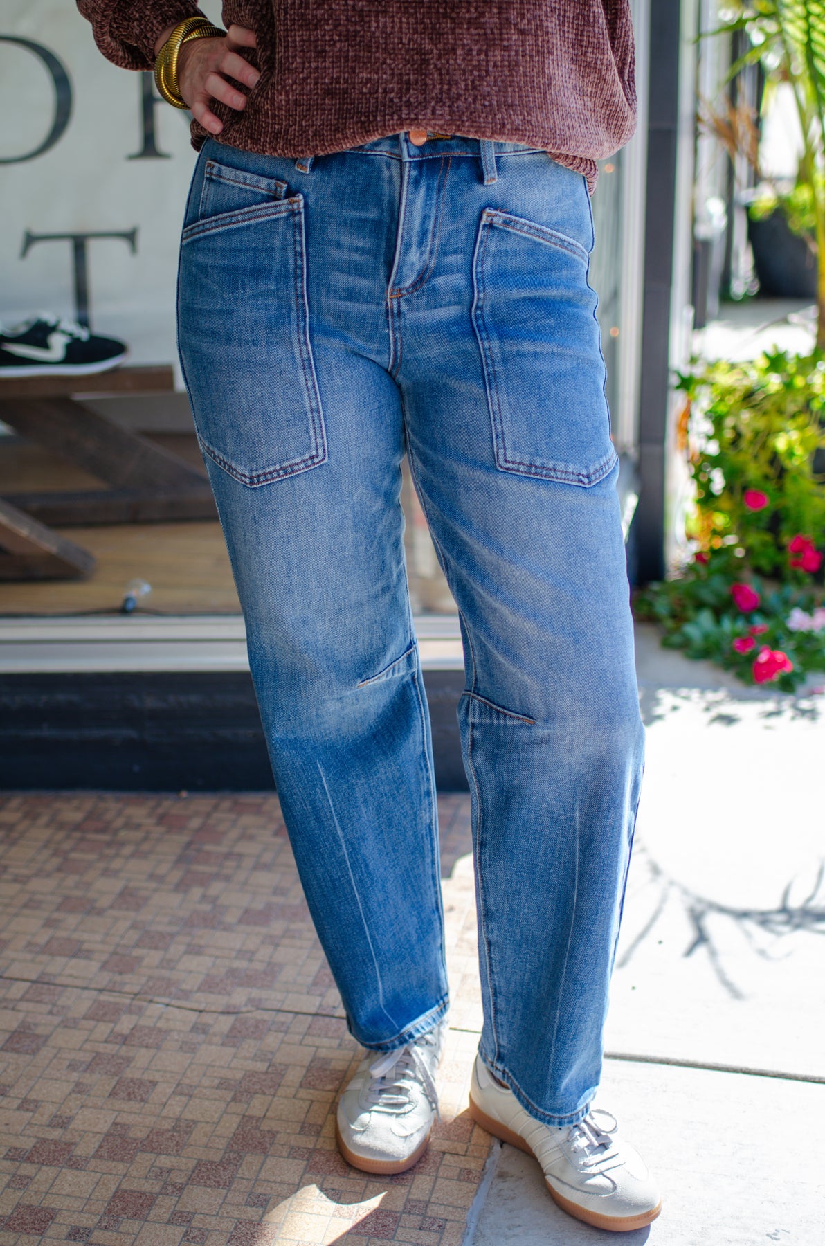These Risen Mid Rise Barrel Leg Jeans in a fun medium wash bring the perfect mix of comfort and style. Crafted with 4-way stretch fabric, they move with you all day long, while the playful patch pocket adds a cool, unexpected twist. Whether you're out for brunch or hitting the weekend vibes, these jeans are your go-to for effortless, laid-back chic.