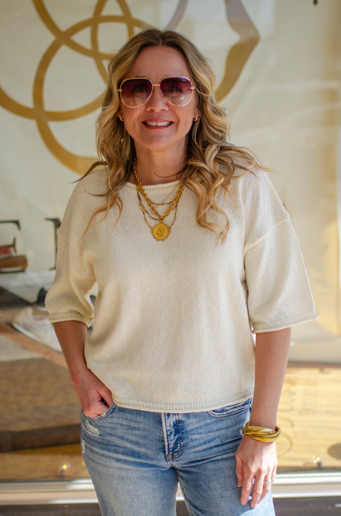 Wrap yourself in effortless elegance with this dreamy cream knit sweater top. Featuring a relaxed drop shoulder silhouette and mid-length sleeves, it's the perfect layer for breezy spring days. The soft, cozy fabric pairs beautifully with its classic round neckline, creating a look that feels both put-together and wonderfully comfortable. Whether you're sipping coffee on the porch or running errands around town, this versatile piece brings that "just right" vibe to any outfit.