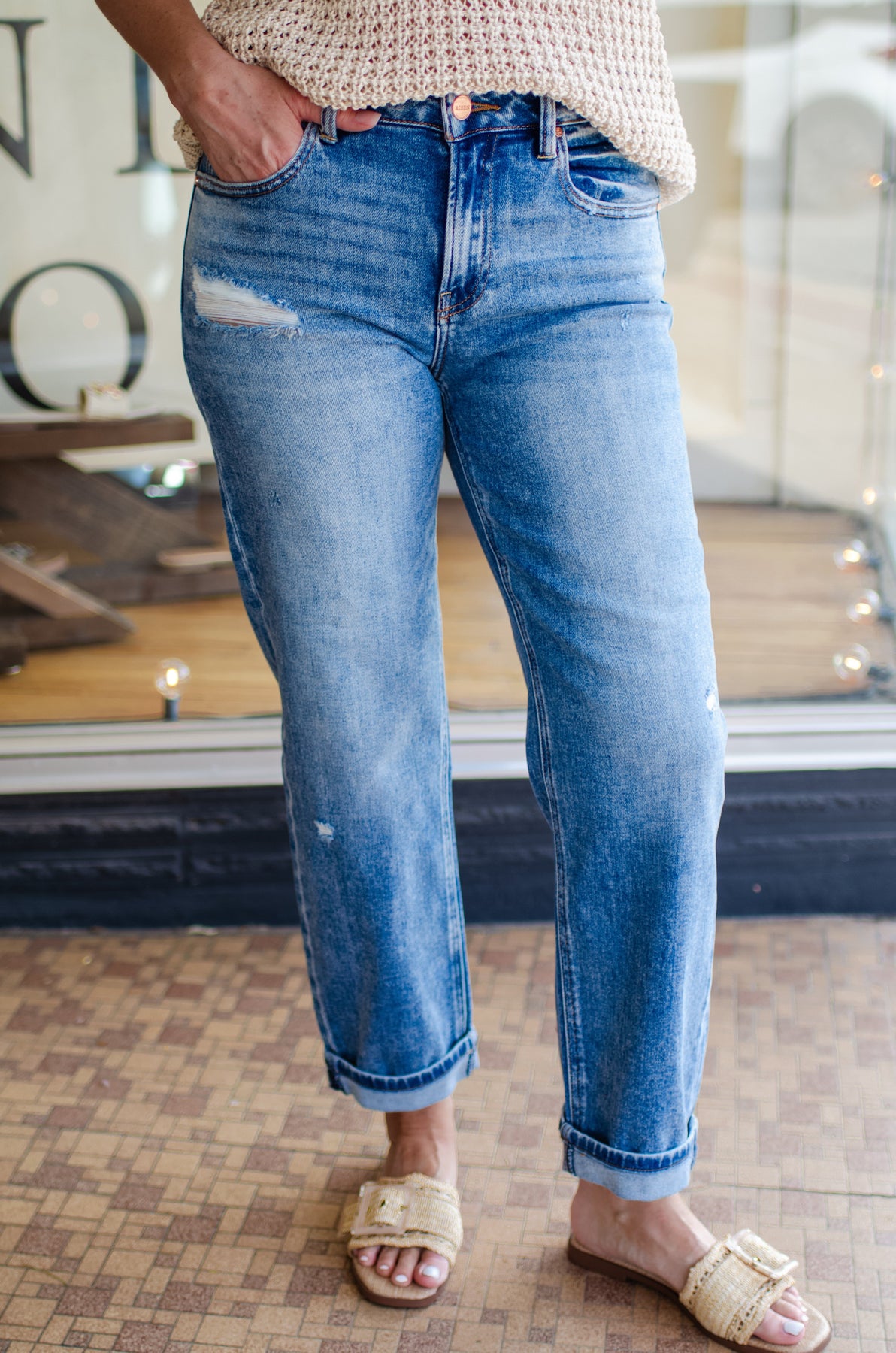 Get ready to rock a casual yet stylish look with these Risen High Rise Distressed Cuffed Boyfriend Jeans in Medium Wash. The high rise and cuffed ankle crop provide a flattering fit while the distressed details add a touch of edginess. Perfect for any occasion, these jeans will elevate your wardrobe to the next level.