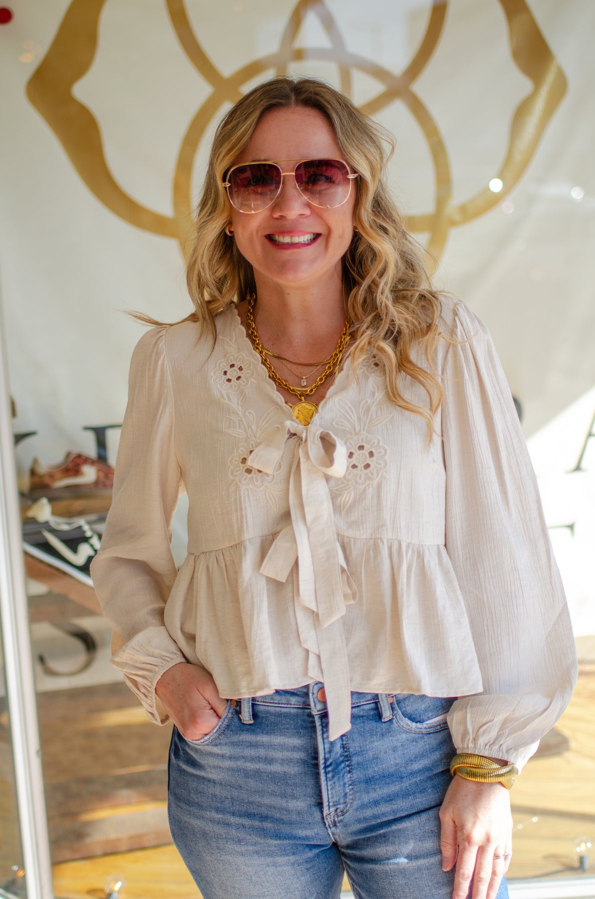 Surrender to effortless elegance with this charming beige long sleeve top. Delicate eyelet crochet detailing and a flirty tie front create an instantly romantic vibe, while the bubble sleeves add a playful twist. The ruffled hem brings movement and dimension to every step. Perfect for date night, brunch, or whenever you want to feel undeniably sweet. Pair with your favorite jeans or a flowing skirt for a look that's equal parts sophisticated and fun.