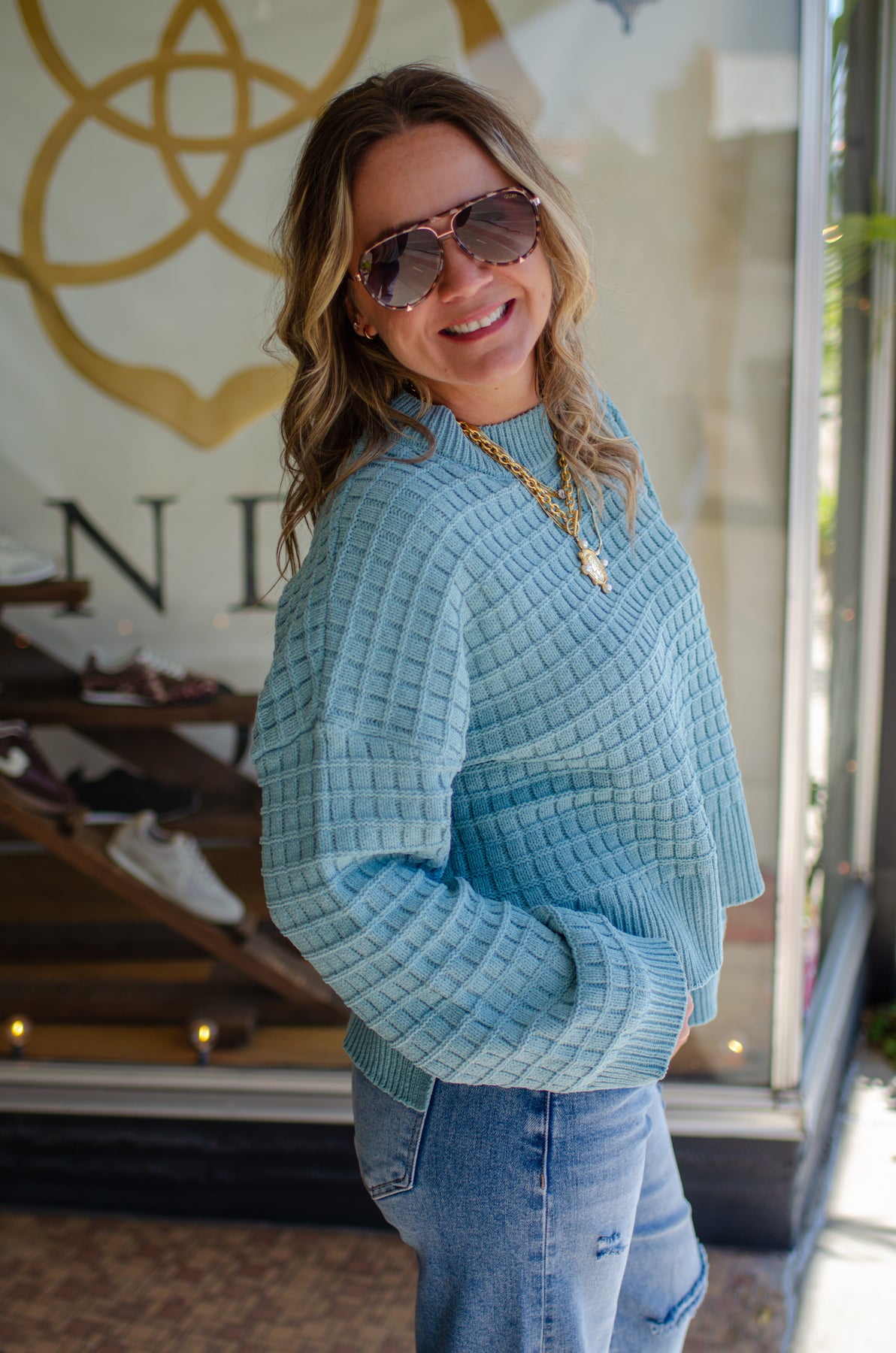 Cozy up in the Take It Easy Textured Knit Sweater in Dusty Teal. This soft knit beauty features a relaxed drop shoulder and a comfy round neckline, perfect for laid-back days. Side slits add a playful touch, while the ribbed hem keeps things snug. Effortless style meets ultimate comfort for your casual wardrobe.