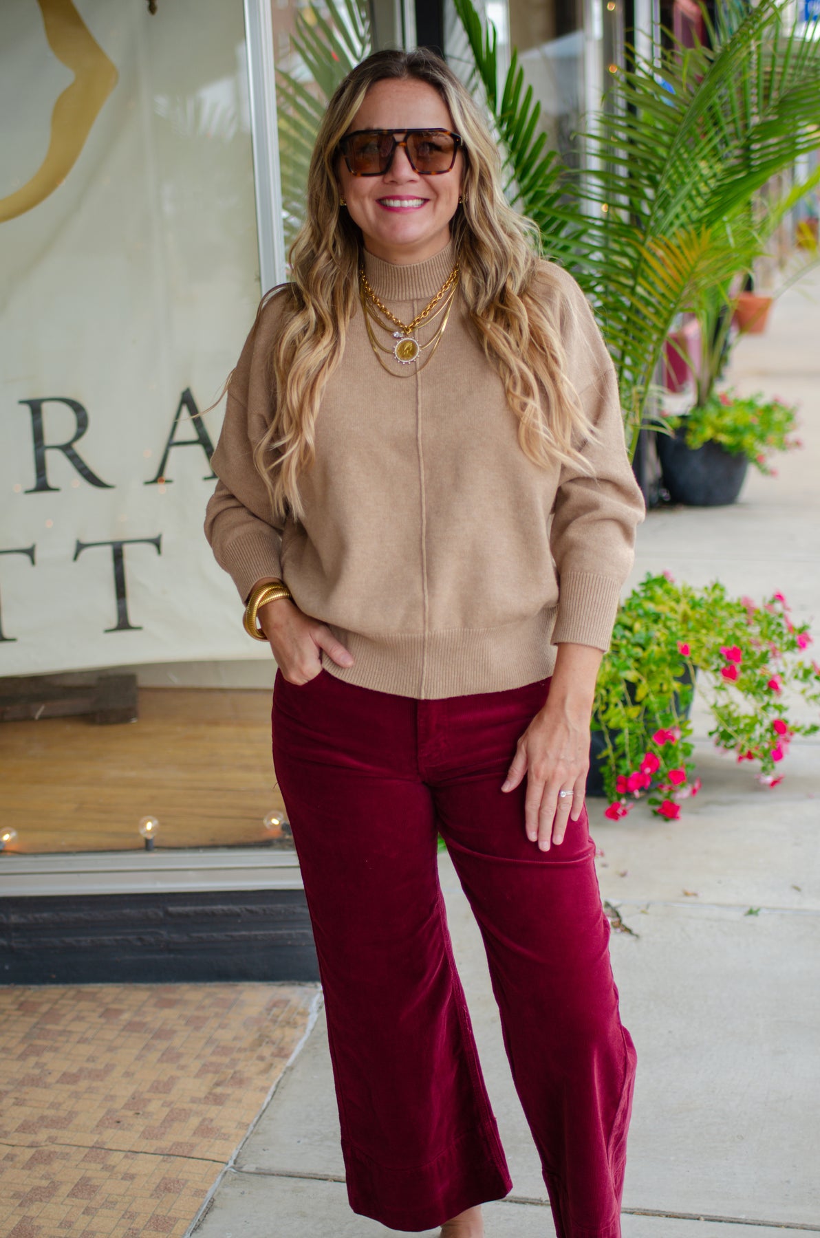 Stay cozy and chic with the Winter Wish Front Seam Mock Neck Sweater. Its camel hue and soft ribbed trims bring warmth and style together, while the relaxed drop shoulder and front seam add a fun twist to your everyday look. Perfect for layering or wearing solo, this knit pullover makes winter feel a little more magical.