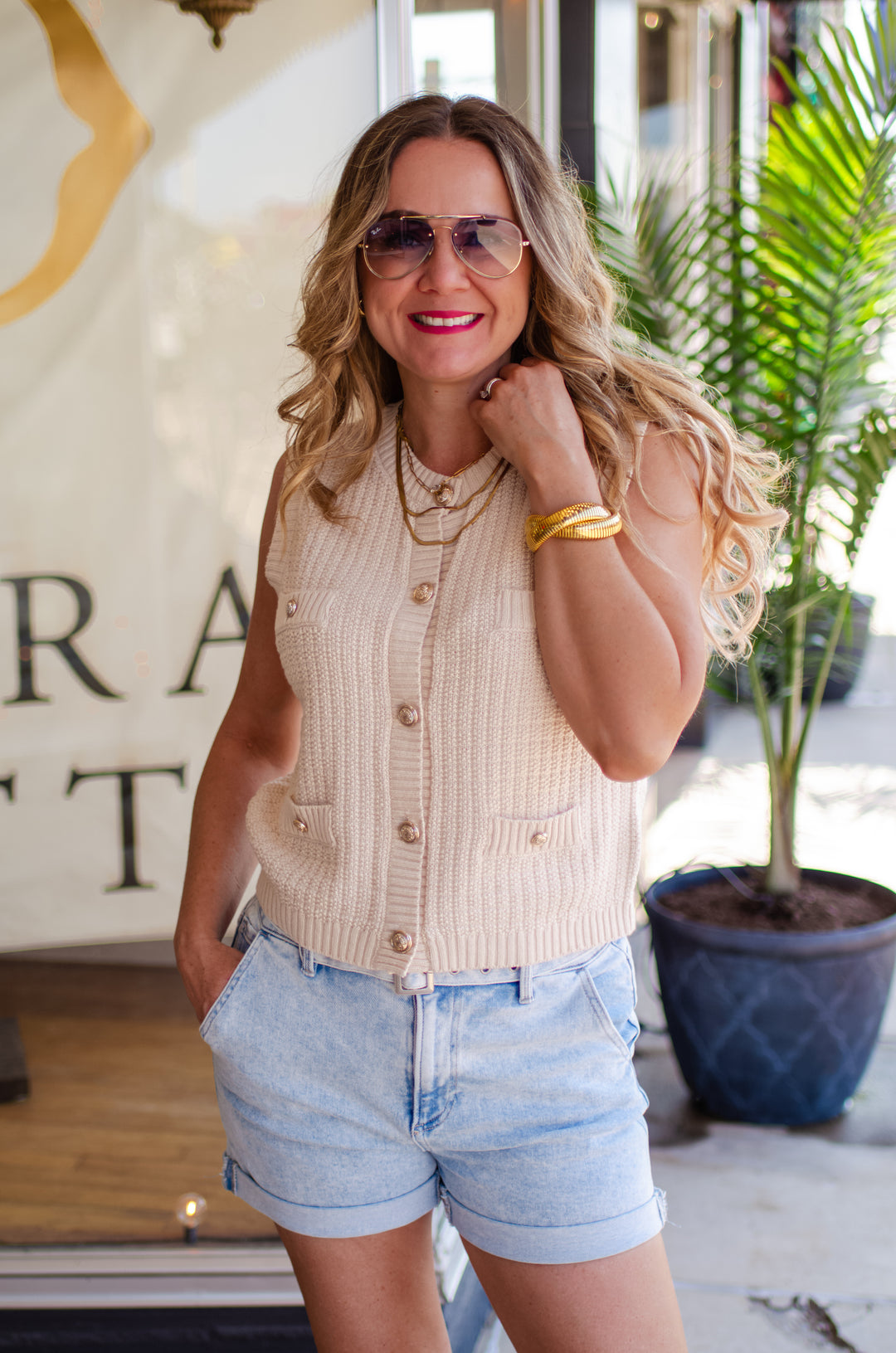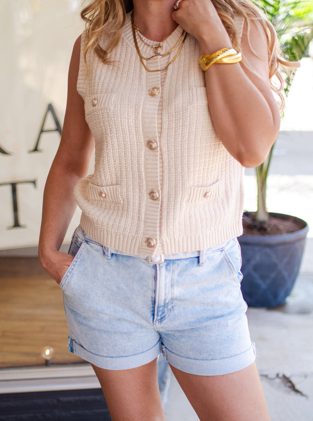 Perfect For You Knit Gold Button Sleeveless Cardigan in White