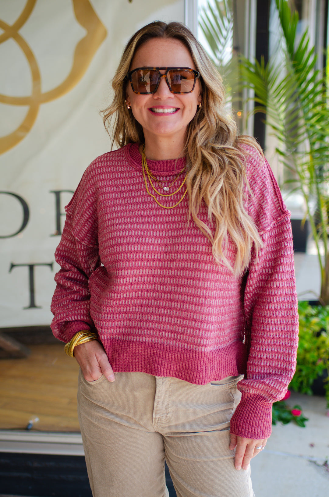 Winter Wish Cranberry Knit Round Neckline Textured Sweater