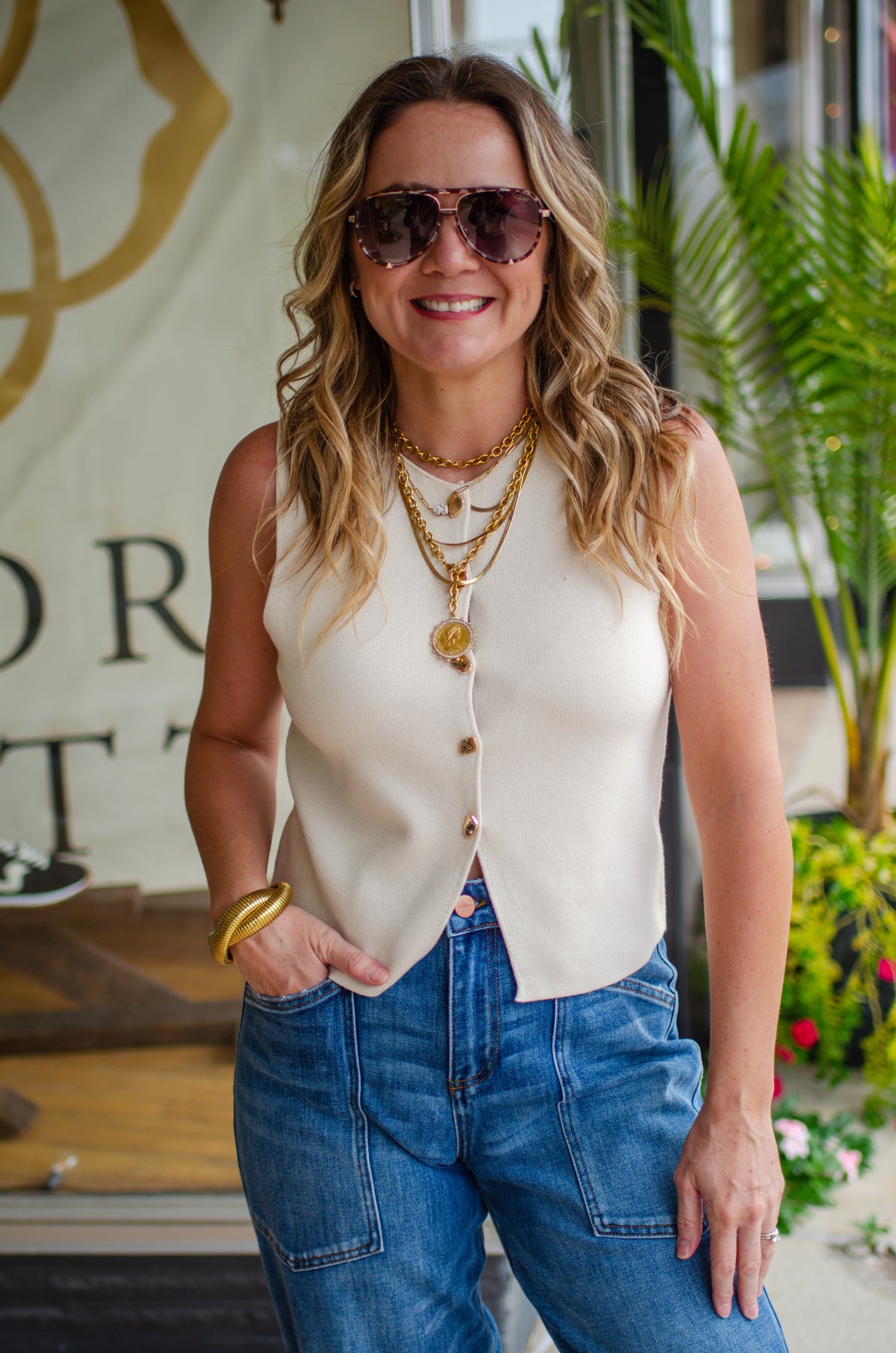 Brighten your wardrobe with this Classic Cream Button Down Top, sparkling with chic gold buttons that add a touch of fun to your day. Whether paired with jeans or dressed up for a night out, this top blends timeless elegance with a playful pop to keep you looking effortlessly fabulous!
