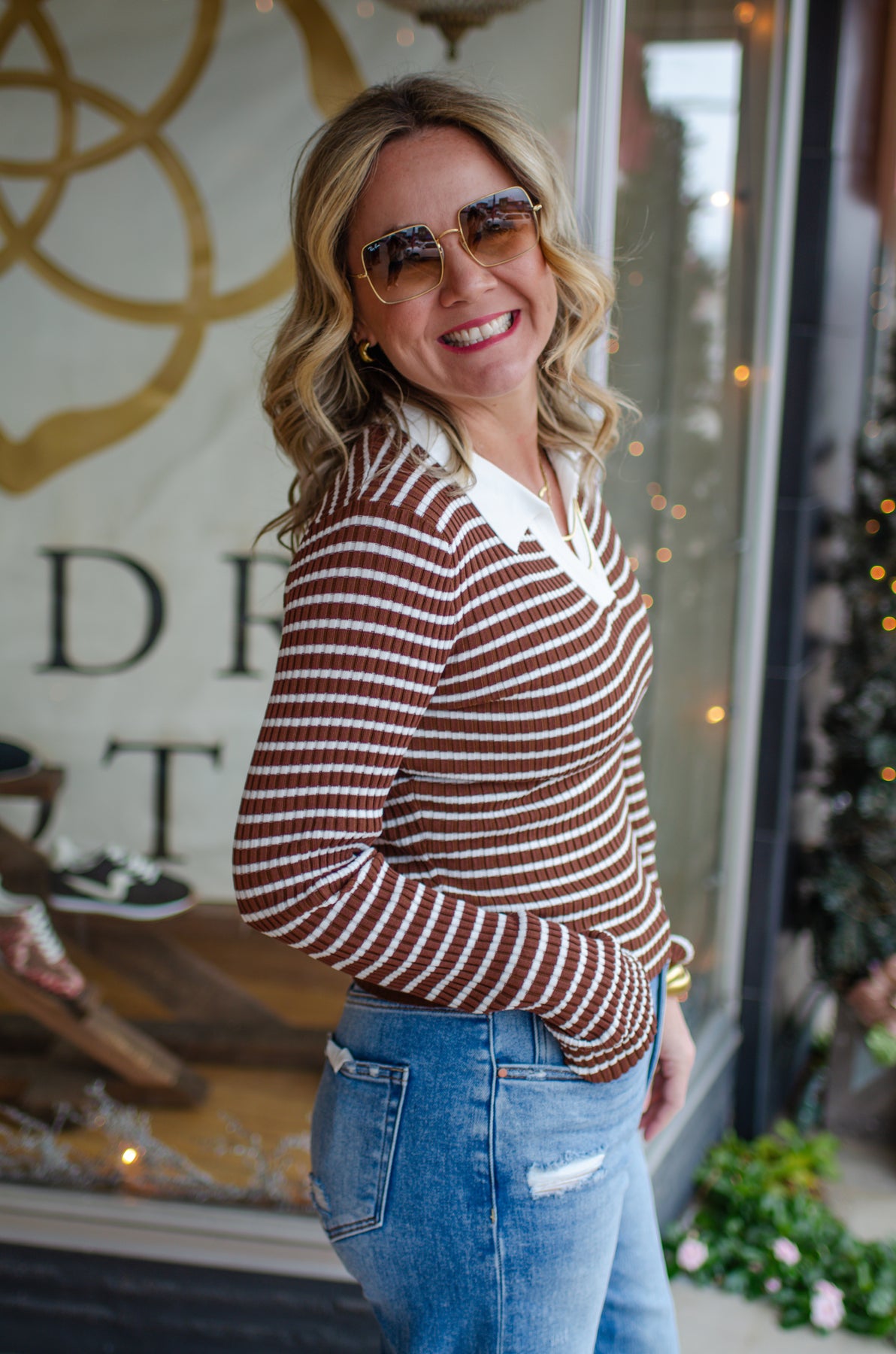 Get ready to take on the day with our Take Heart Fitted Stripe Collared Long Sleeve in Chocolate & Ivory! Made with stretch ribbed fabric, this top offers both comfort and style. Soft knit material and a unique wine and ivory color combo make this a must-have addition to your wardrobe.