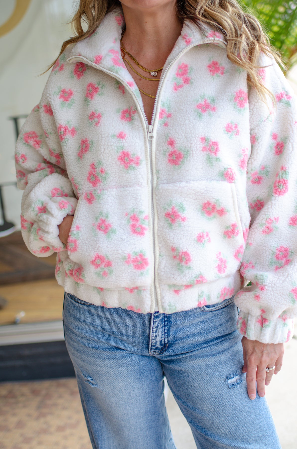 Stay cozy and cheerful in this Pretty Pink Floral Sherpa Zip Up Jacket. Featuring a soft sherpa lining, a fun girly floral print, and a full zip front, it’s perfect for layering on chilly days. The hood and handy pockets add extra warmth and convenience, making it your go-to jacket for a playful yet comfy look.