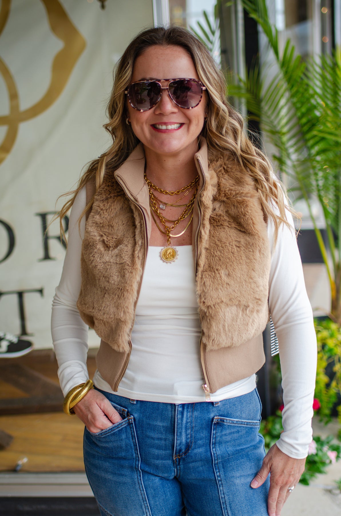 Wrap yourself in cozy glamour with the Winter Wonder Faux Fur Vest in Camel! This luxe layering piece features a convenient front zip and a stretchy waist for the perfect fit. Whether you're bundling up for chilly days or adding texture to your outfit, this vest delivers warmth and style in equal measure. Soft, snuggly, and undeniably chic—it's the ultimate cold-weather companion that makes you feel like you're living your best life!