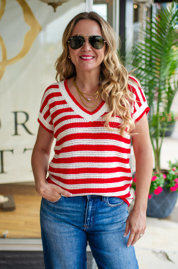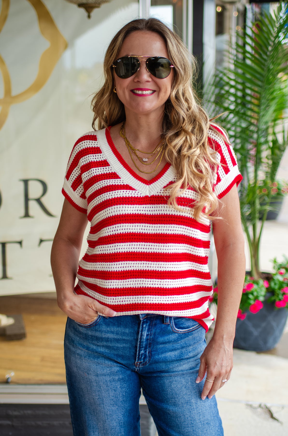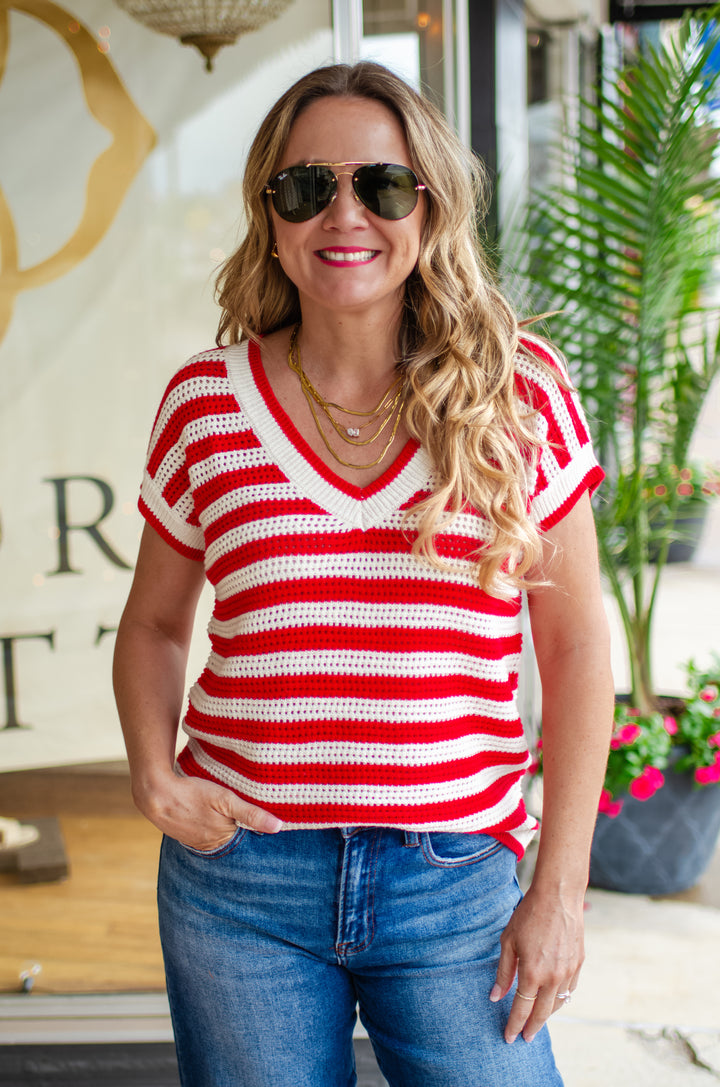 Get ready to set sail with our Nautical Stripe V-Neck Knit Sweater! This cream and red sweater features an open knit design and ribbed neckline and hem. Perfect for a day out on the water or for a casual day out. Don't miss out on this playful and stylish piece!