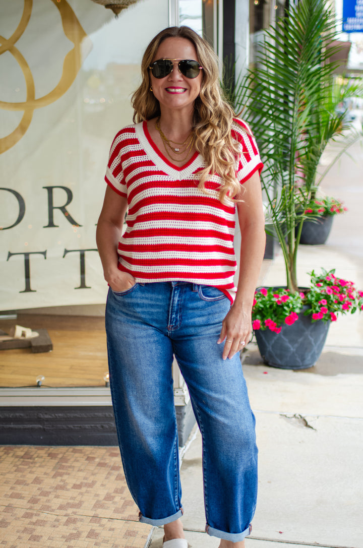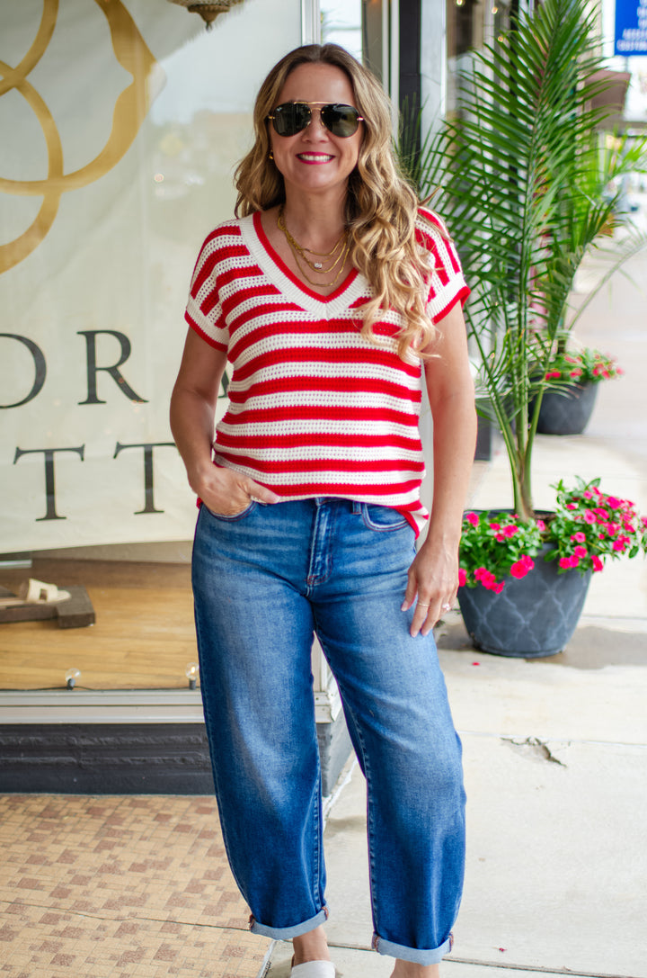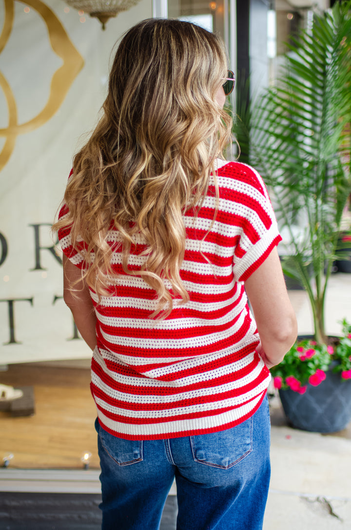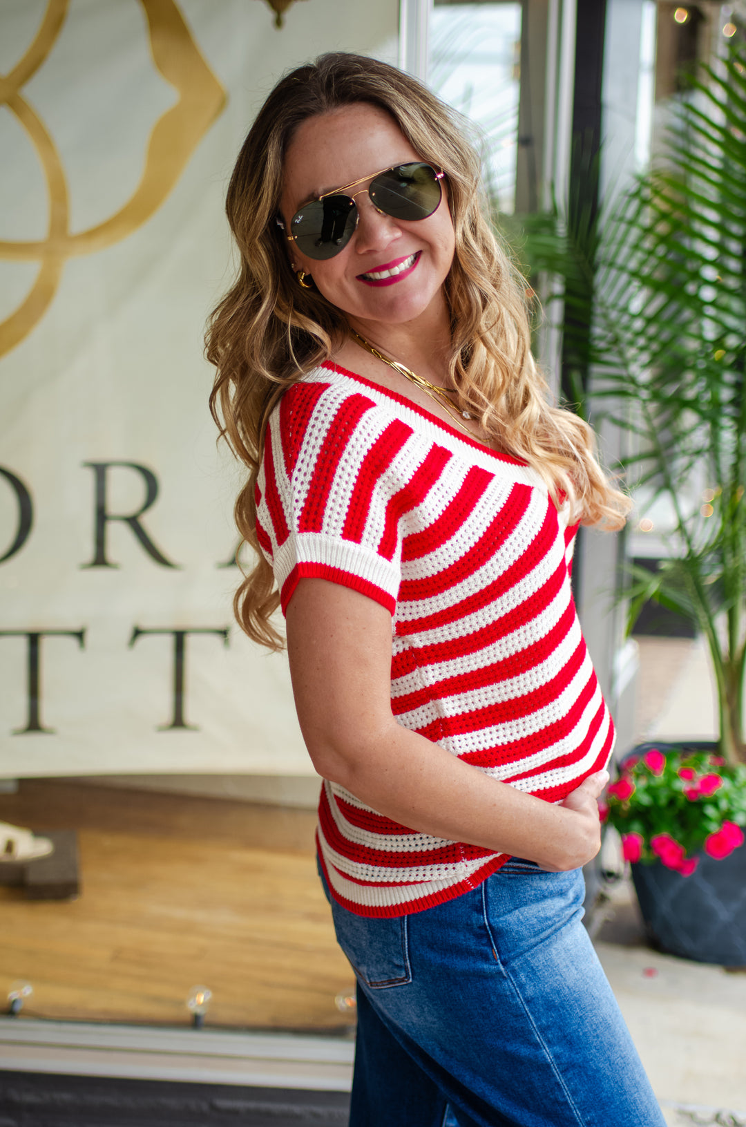 Get ready to set sail with our Nautical Stripe V-Neck Knit Sweater! This cream and red sweater features an open knit design and ribbed neckline and hem. Perfect for a day out on the water or for a casual day out. Don't miss out on this playful and stylish piece!